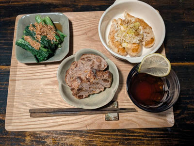 (今夜の夕食。すり鉢で胡麻をすり、小松菜のお浸しに。ささみには、ネギを軽く炒めたのを乗せました。香りとビジュアルのアクセントで、美味しくなります。まあ、単に焼き鳥のネギマをヒントにしただけですが。)