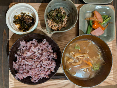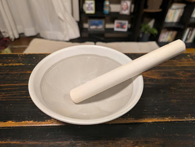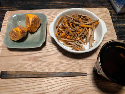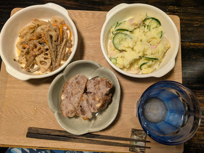 (今夜の夕食。すり鉢で胡麻をすり、小松菜のお浸しに。ささみには、ネギを軽く炒めたのを乗せました。香りとビジュアルのアクセントで、美味しくなります。まあ、単に焼き鳥のネギマをヒントにしただけですが。)