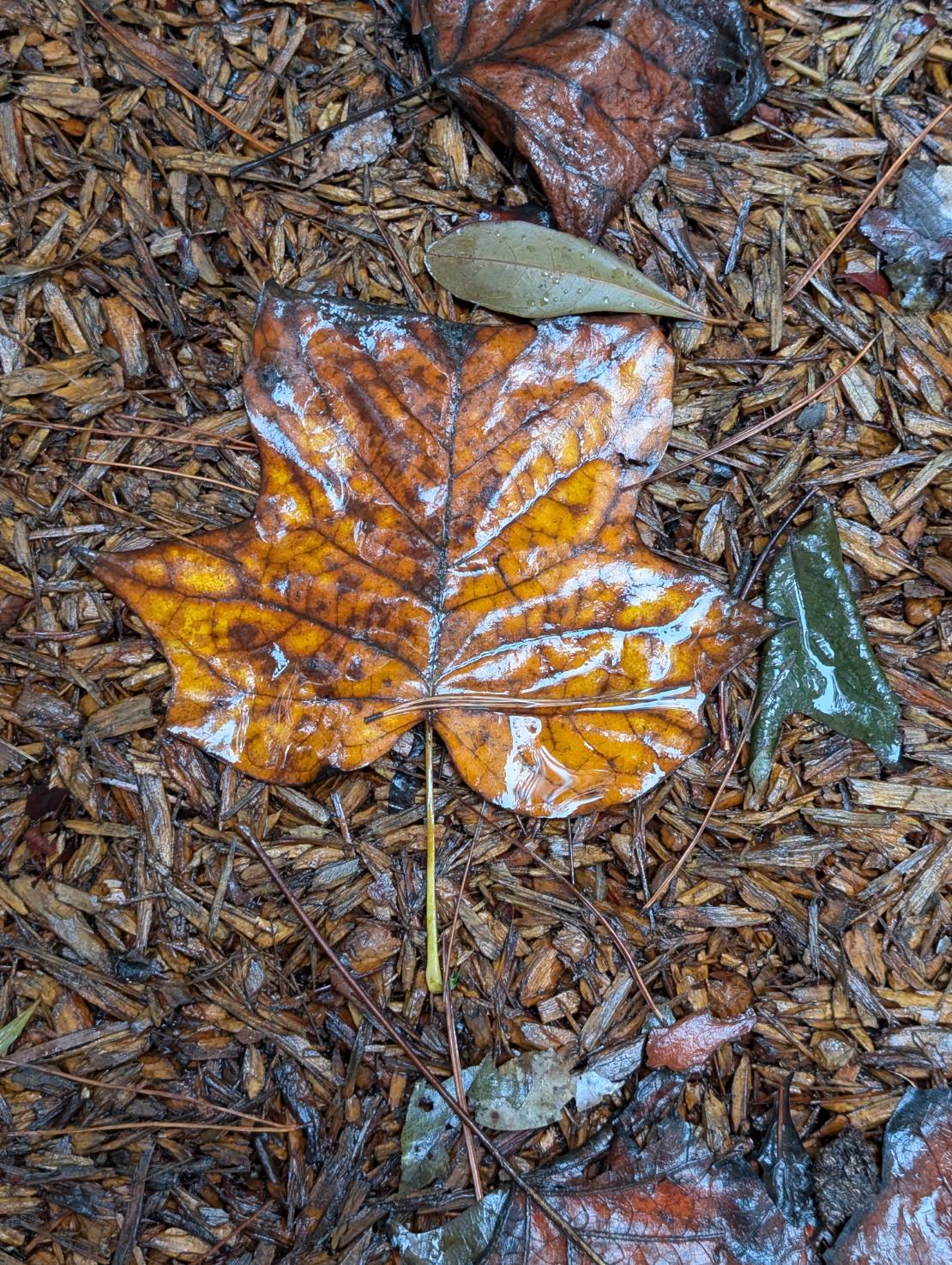 (落ち葉だって雨にぬれて、光って美しく感じます。)