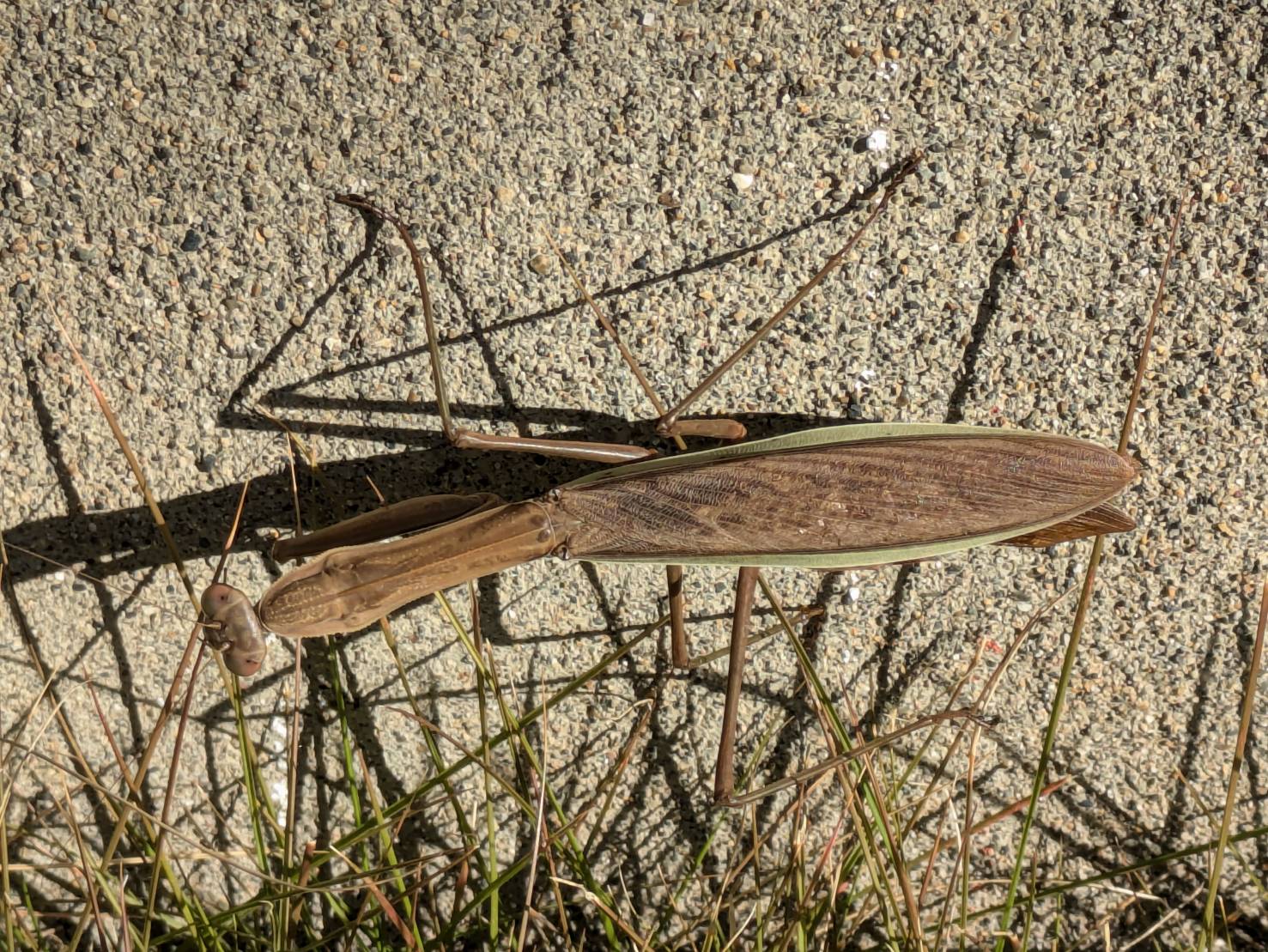 (餌の虫が居なくなると生きられない「オオカマキリ」が、まだ頑張っておりました。この冬はやはり暖かいのですね。)