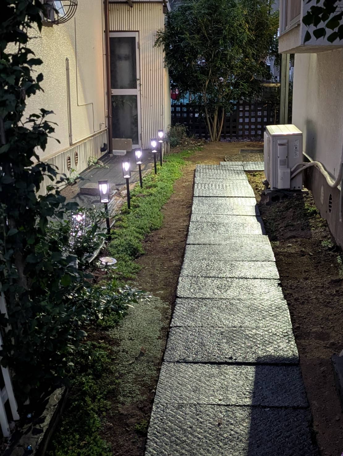 先の長いバリアフリー工事ですが、段差を極力無くしスロープ化した外通路にソーラーライトを並べて明るく致しました。