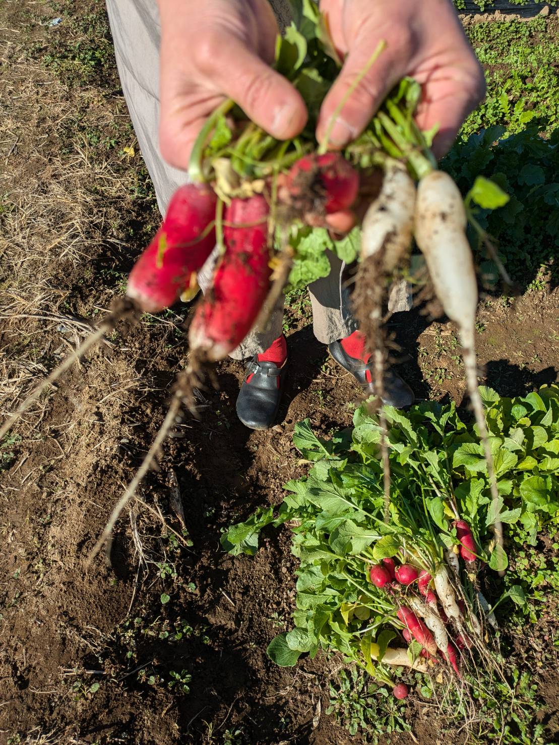 つやつやして大きな「二十日大根」(ラディッシュ)に大感激する妻。