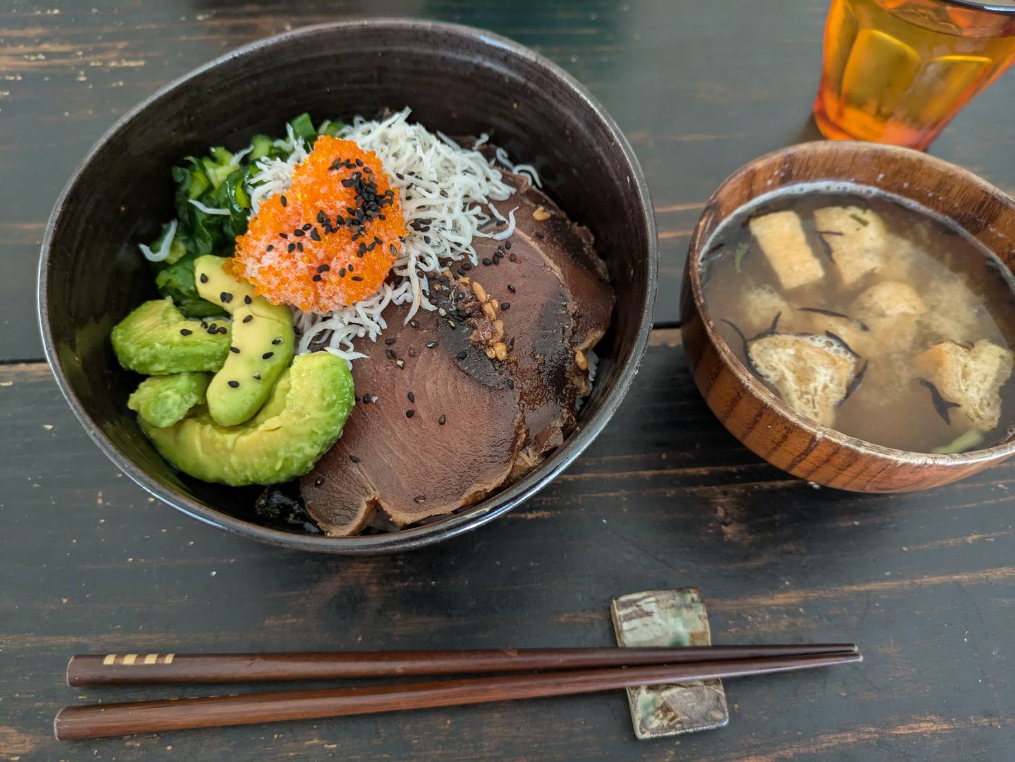 (本日の愛妻ランチは、カツオの漬丼アボカド、シラス、トビっ子…トッピングでございました。)