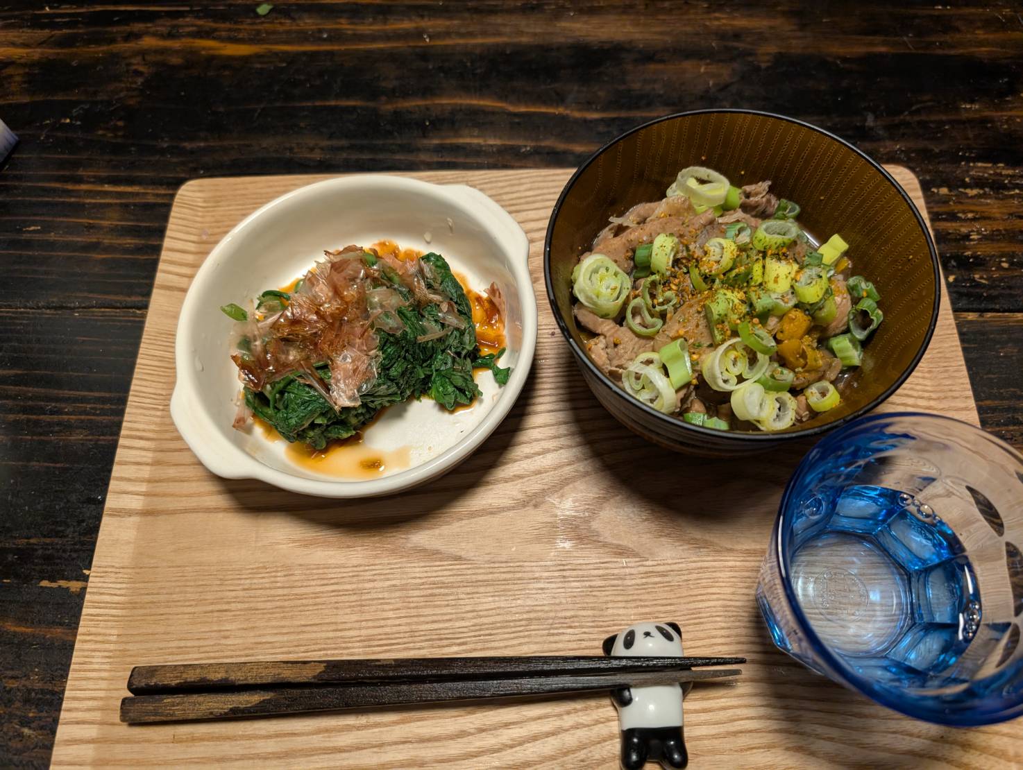 昨晩のおつまみ兼の夕食です。採れたて春菊を買ってお浸しにしましたら絶品でございました。生でも食べられますので茹で時間は熱湯で10秒ほど。香りが立って素晴らしい味わいでございました。それと作り置きしてあったモツ煮を解凍して温めたものでございます。