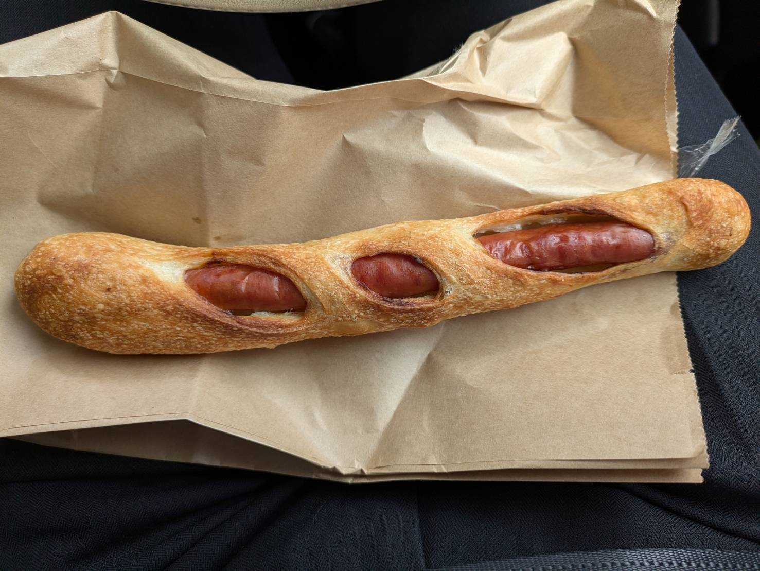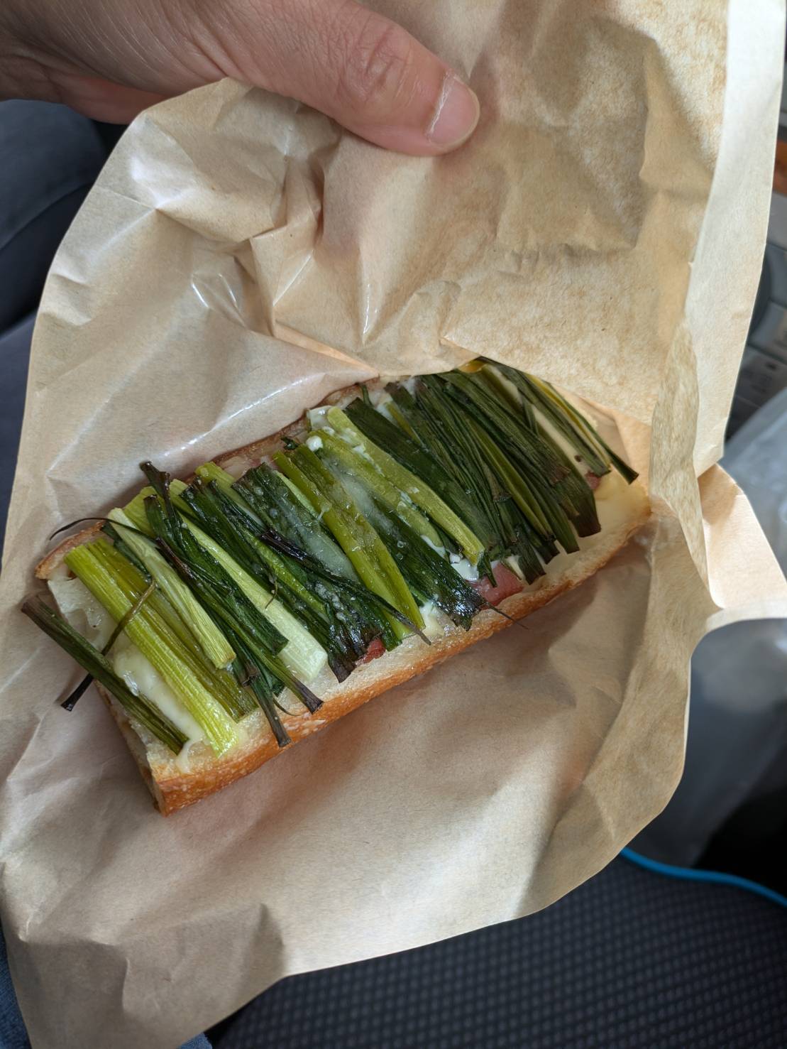 (妻のチョイス、青ネギとゴルゴンゾーラが乗ったバゲット。こちらも美味しゅうございました。焼き立てが食べてみたい!)