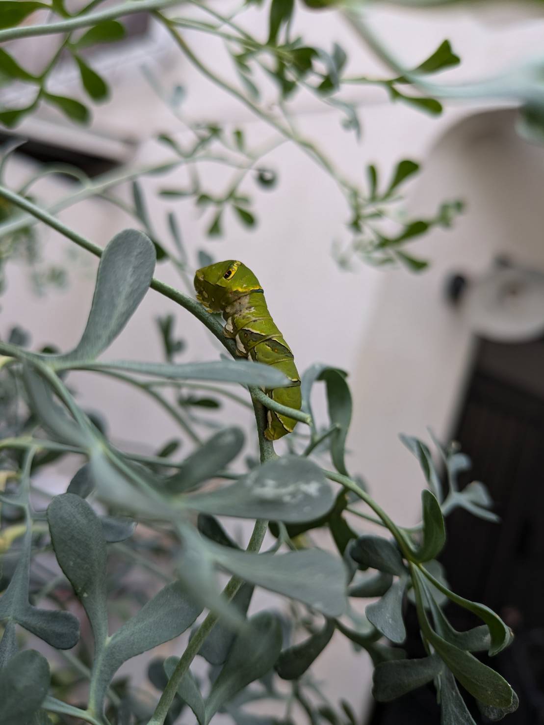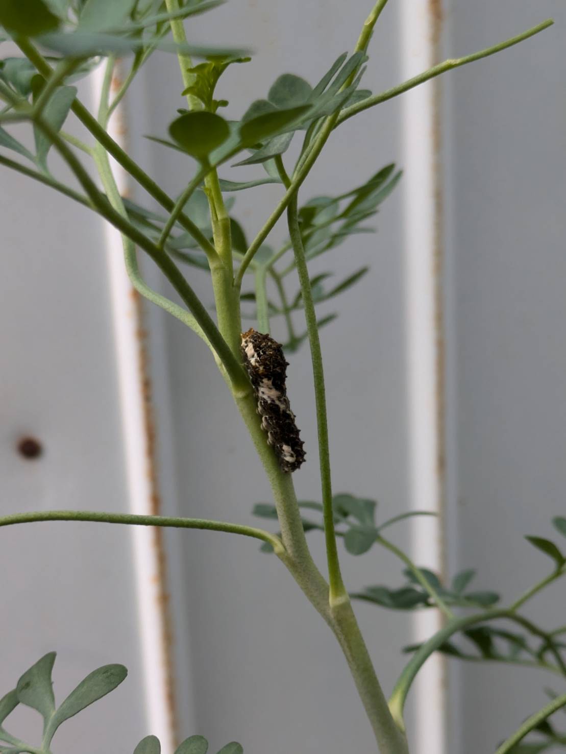 (ミカン科のヘンルーダにアゲハの幼虫がおります。「小さな幼虫は、鳥のフンにしか見えない。」と言う妻。う〜、フンのフリして鳥に食べられない様にしていたとは。)