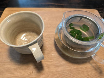 スペアミントの葉5〜6枚に熱湯を注ぎ、待つこと3〜4分。綺麗な緑色のスペアミントティーが頂けます。
