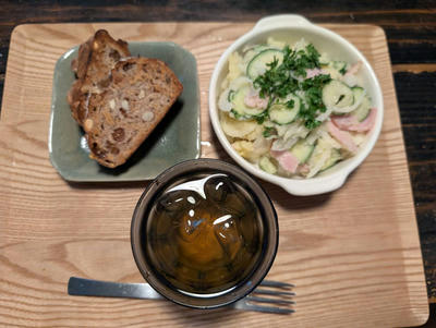 ちょっとジャガイモの在庫が足りなかったのですが…めっちゃ美味しくできたので自分でもびっくり。一人でうなりながら頂いた次第です。素材の良さと安くない「ヤマギシ」のマヨネーズの威力のお陰だと思いながら、感謝して頂きました。早い時間にスタートでしたが、焼酎の有機麦茶割り3杯きっかりを頂いて乗務のために早く休んだ次第でした。