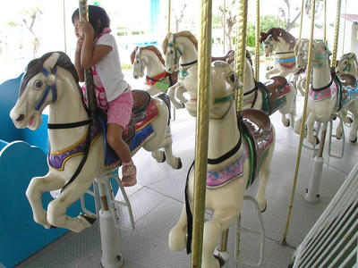 回転木馬にバックミラーは無いので、確かに振り返えらないと後ろの人は見えない。振り返って「楽しいね!」と笑顔でアイコンタクトする。