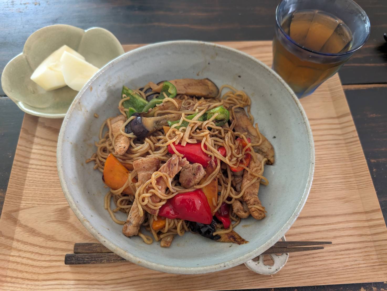 ピーマンの苗を1本植えて、今年は大豊作。30個は収穫したと思います。赤ピーマンまで成りましたので、カラフルな焼きそばになりました。