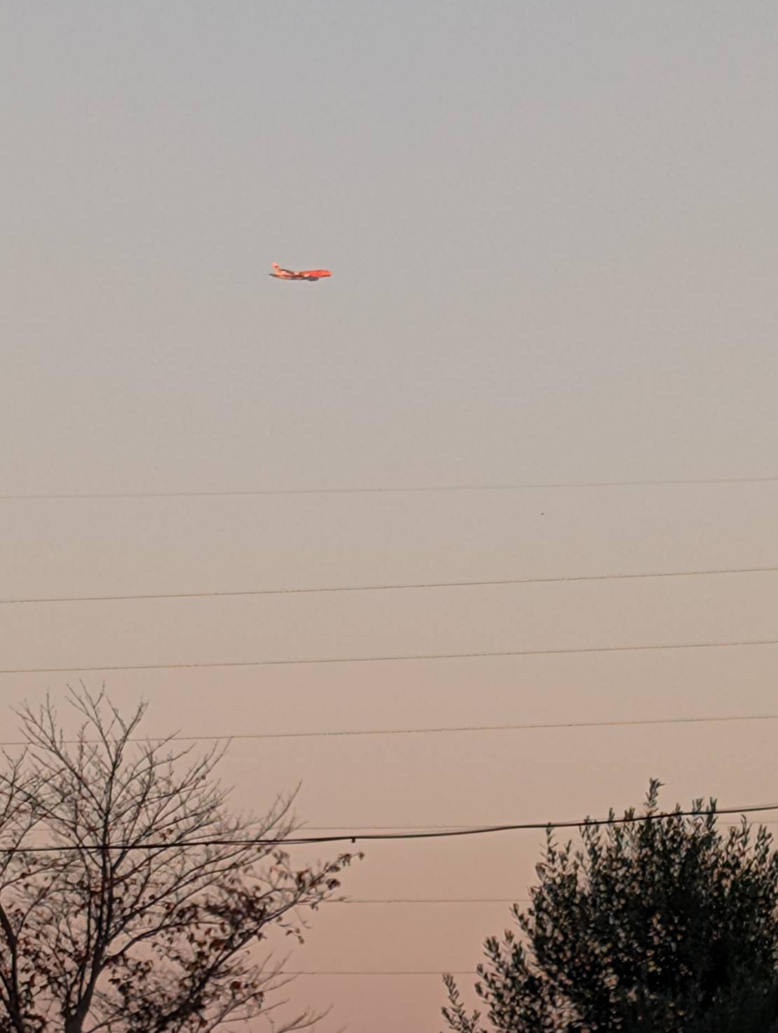 (夕方の出庫前。飛行機に夕日が当たって赤くなっていた。スマホで撮っていたら「ワア〜!」と介助人さんが一緒に見ていた。)