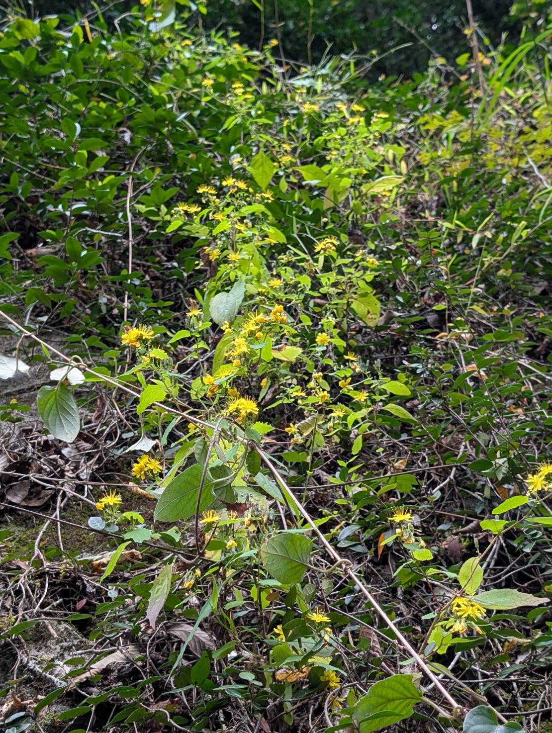 (神社の石垣に咲いていた「薬師草」。葉が薬師如来の後ろに似ているそうです。)