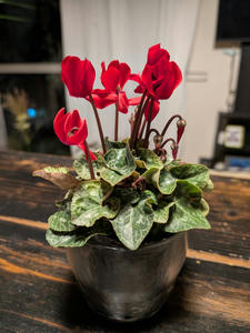 (早くもシクラメンが、出回り始めました。小さくて真っ赤なシクラメンを200円で買って来ました。)