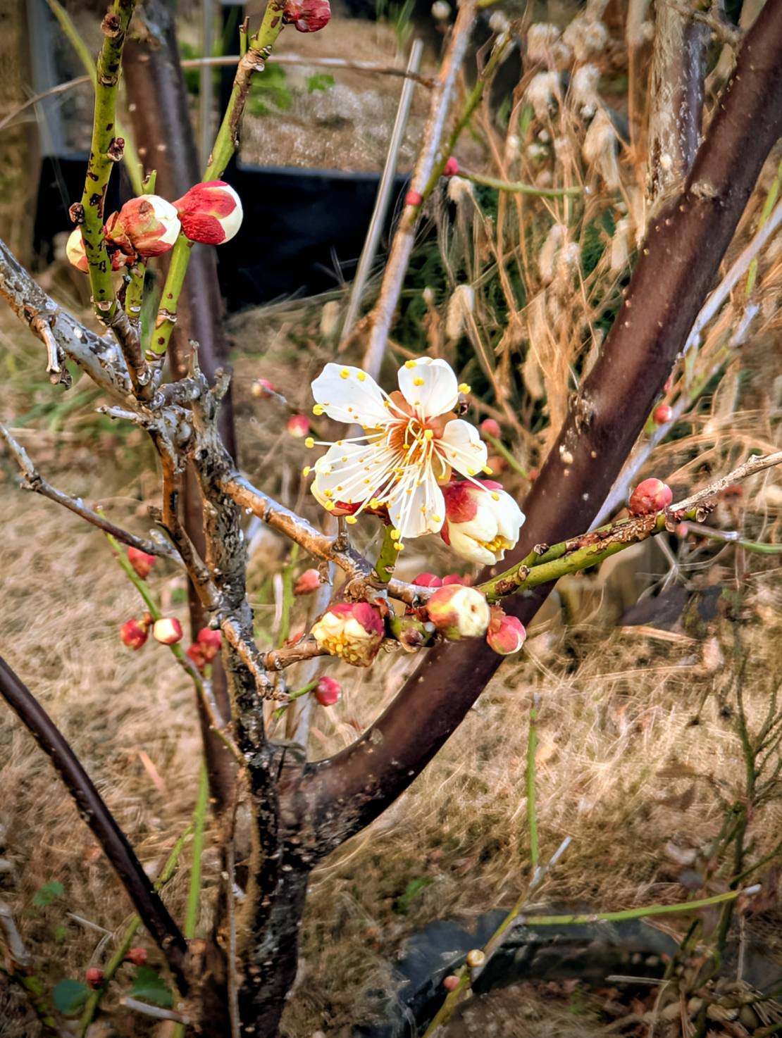 (まだまだ寒いのですが、今日から2月。庭の南高梅が開花しました。)