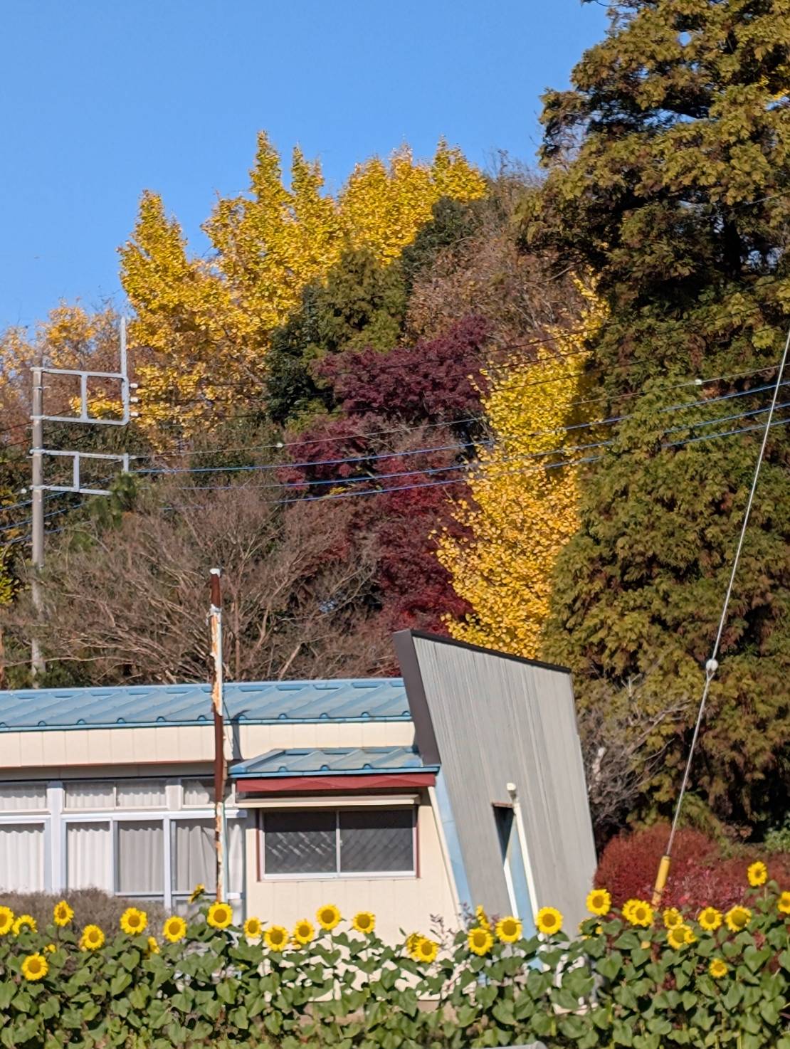 紅葉する木々を背景にヒマワリが咲いているので驚く。