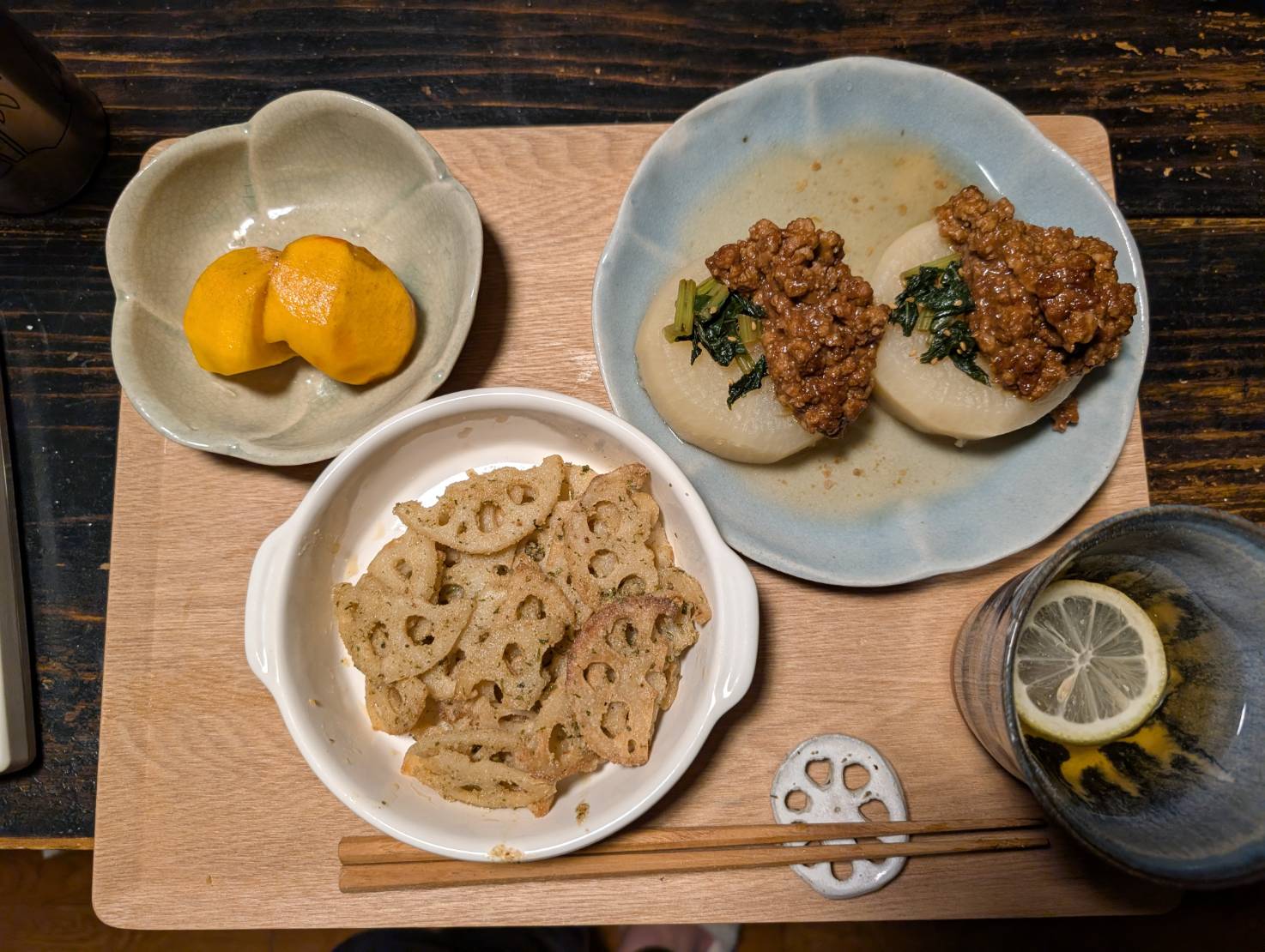 (スクールバスは、帰宅が早いので「ふろふき大根」と「レンコンチップ」を作って見ました。ふろふき大根には柚子味噌にひき肉を加えて見ました。柚子をケチらずに、皮を擦ってたっぷり入れて見ました。いやぁ〜、感動的に美味しく出来ました。レンコンチップは、米粉の衣を付けて少なめのごま油で揚げ、青海苔をまぶす。カラッとして、こちらも美味い。一人で唸りながら頂きました。「唸っても一人」と言うのが残念でしたが。)