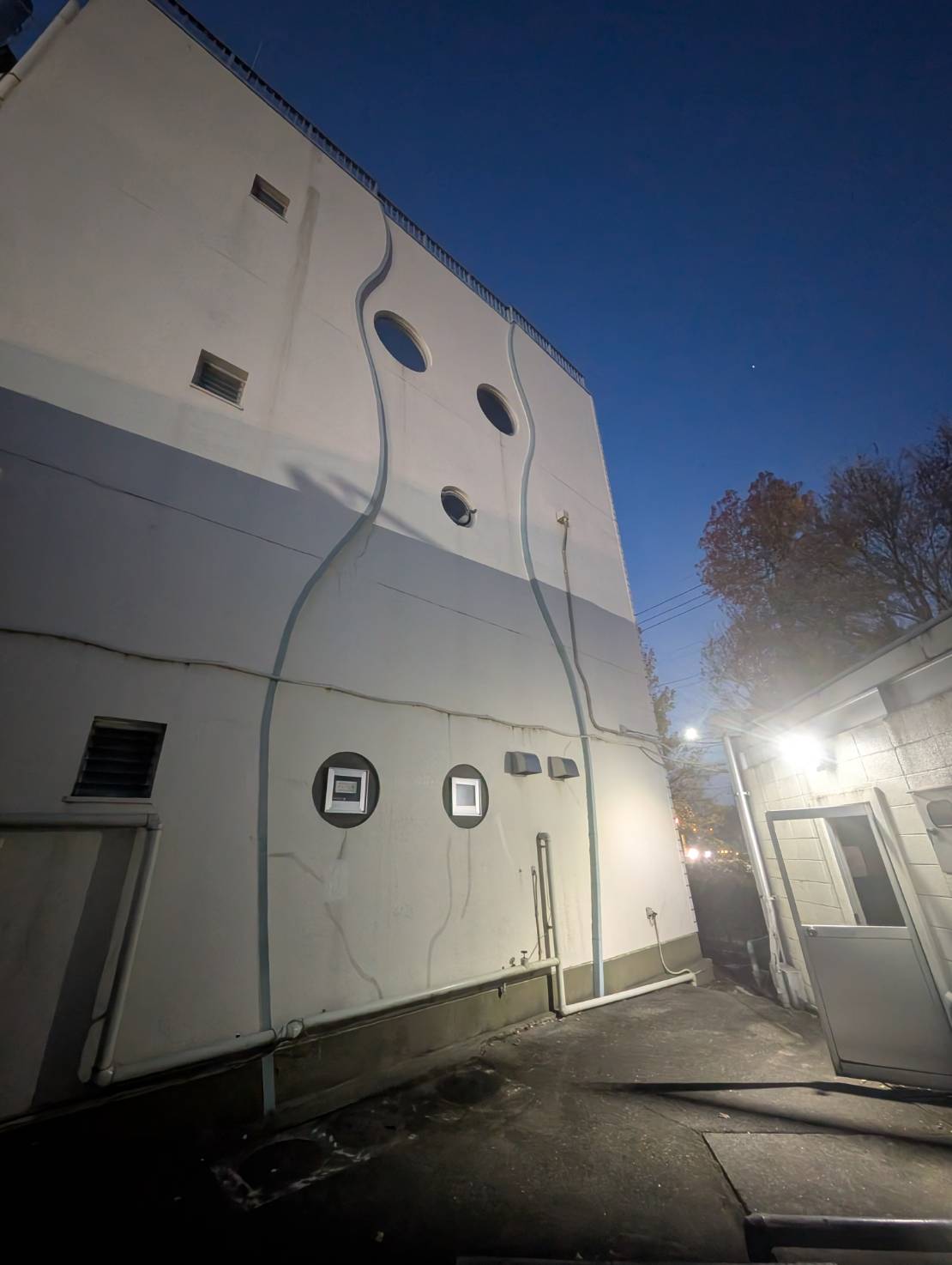 会社の社屋脇にあります。まだ暗いので、仕方ないので壁を眺めながらでした。