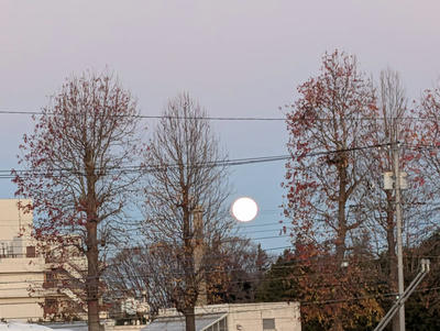 出庫前の点検や日報の準備を終えると満月のスーパームーンが見えました。「お〜っ満月だよ。願い事をするか。」と写真を撮りましたら、脇で一緒に撮っておりました。どんな希望や願いがあるのかな?なんて、見ておりました。