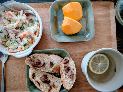 と言う訳で同乗研修分だけ、休憩時間が短くなります。なのでランチは手抜きなれど、頂いた美味しい手づくりポテトサラダの残りにハムやパセリを加えてちょっと変化させて頂きました。それから天然酵母ライ麦パンにヌテラ。スペアミントティーです。そして、やはり頂きものの柿です。シャキシャキして甘い晩秋の柿のデザートです。