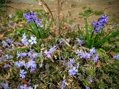 家の庭では、まだ枯れ葉状態の中で芝桜が咲き、分球したヒヤシンスも精一杯咲いておりました。細やかながら紫の祭典です。