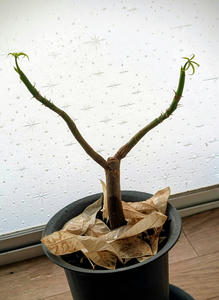 植物にも水やりを致しましたら、すっかり葉が落ちたパキラから新芽が出て来たのを見つけました。