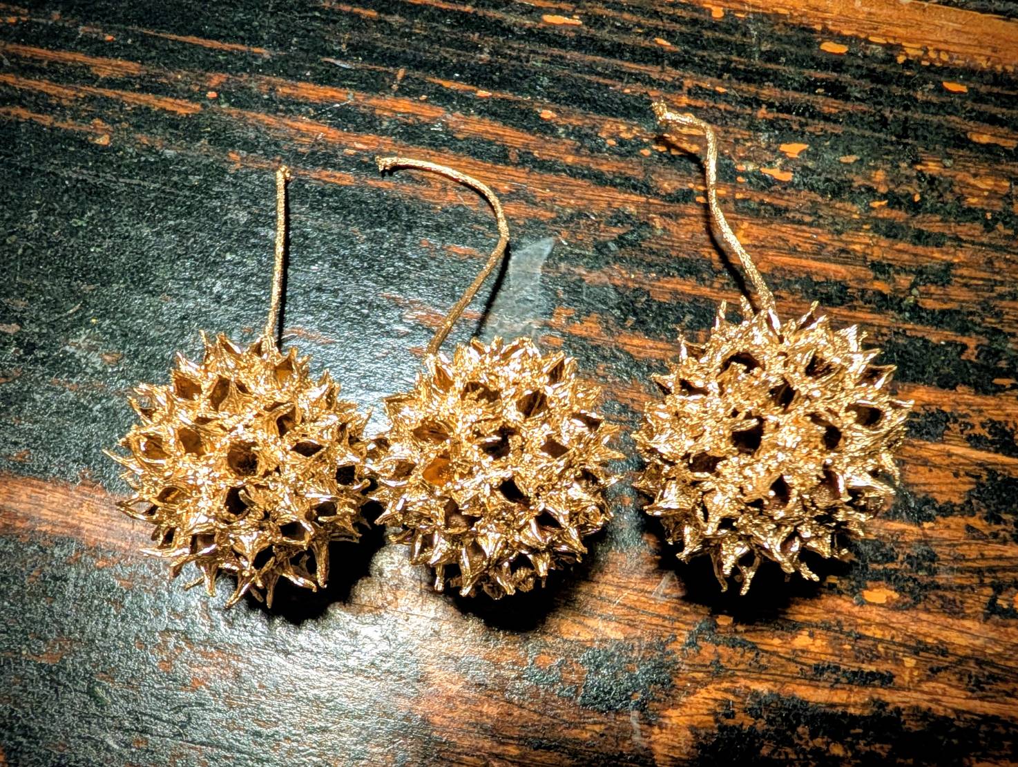 (モミジバフウの実を、ゴールドに塗って見ました。同じものがメルカリで売られていたのには驚きました。)