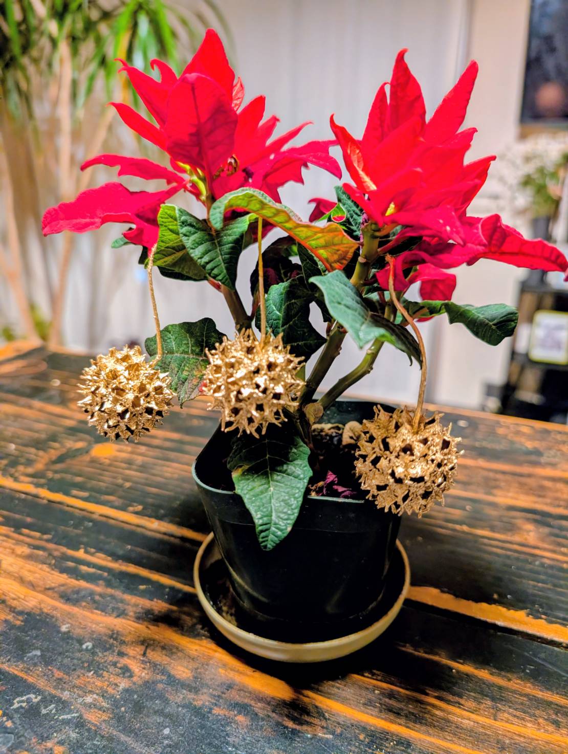 (昨年12月から3ヶ月咲き続けているポインセチアに釣るして見ました。)