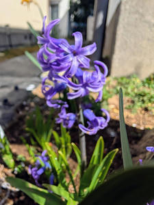 (分球して植えておいたヒヤシンスが、庭のあちこちで開花し始めました。やはり、来年を考えてもっと整然と植え直さなければと思います。)