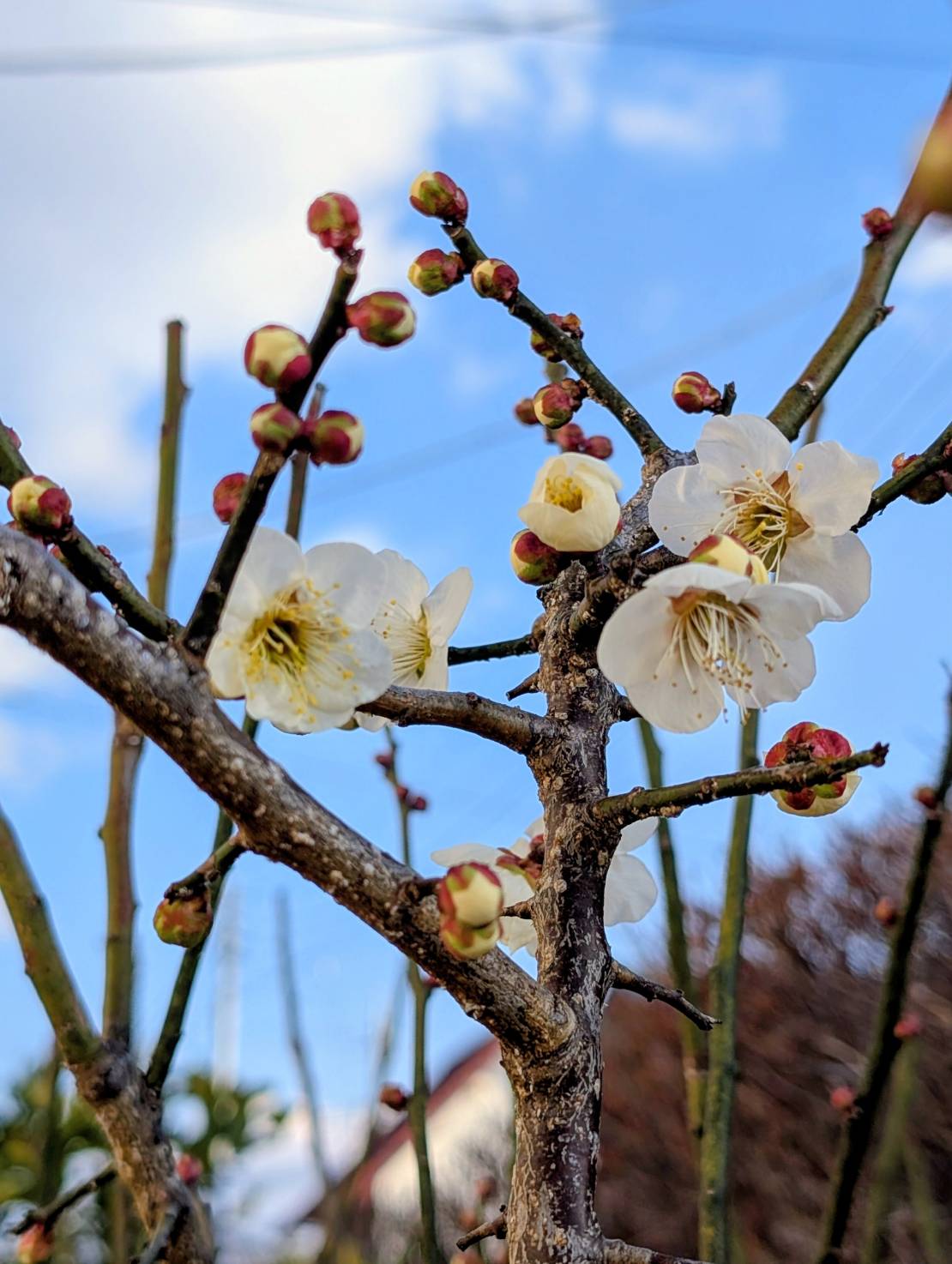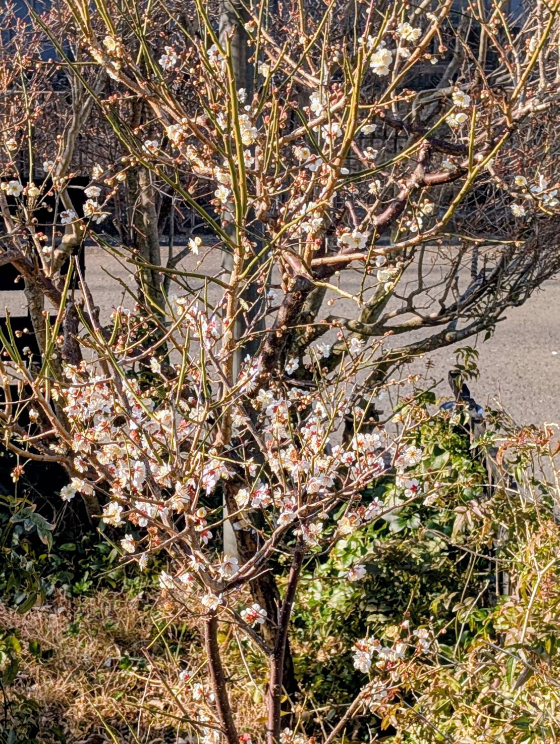 まだ小さな二本の梅の木が、満開状態になり良い香りを放っております。